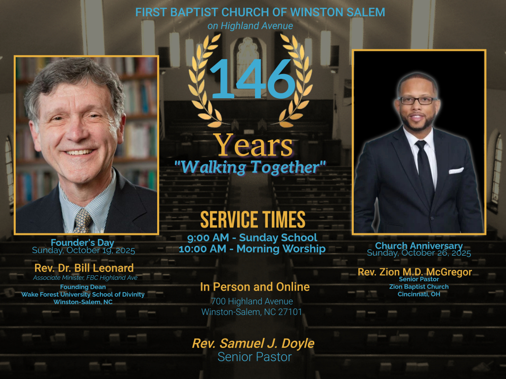 First Baptist Church will celebrate our 146th Founder’s Day and Church Anniversary on Sunday, October 19, and Sunday, October 26, with the theme “146 Years of Walking Together.” We’re pleased to announce our speakers for these special services!