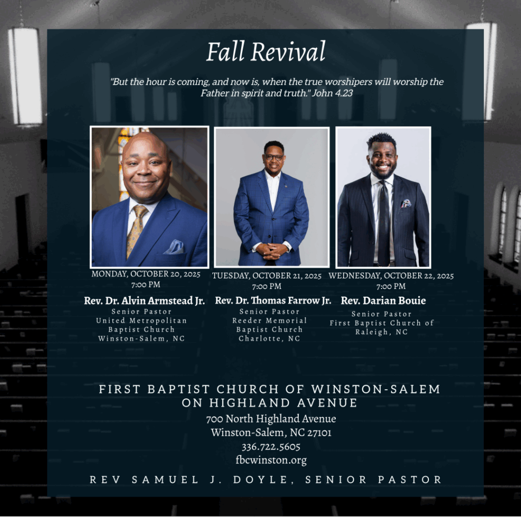 Rev. Samuel J. Doyle is the Senior Pastor of First Baptist Church. Please contact the Church Office at (336) 722-5605 for additional information.