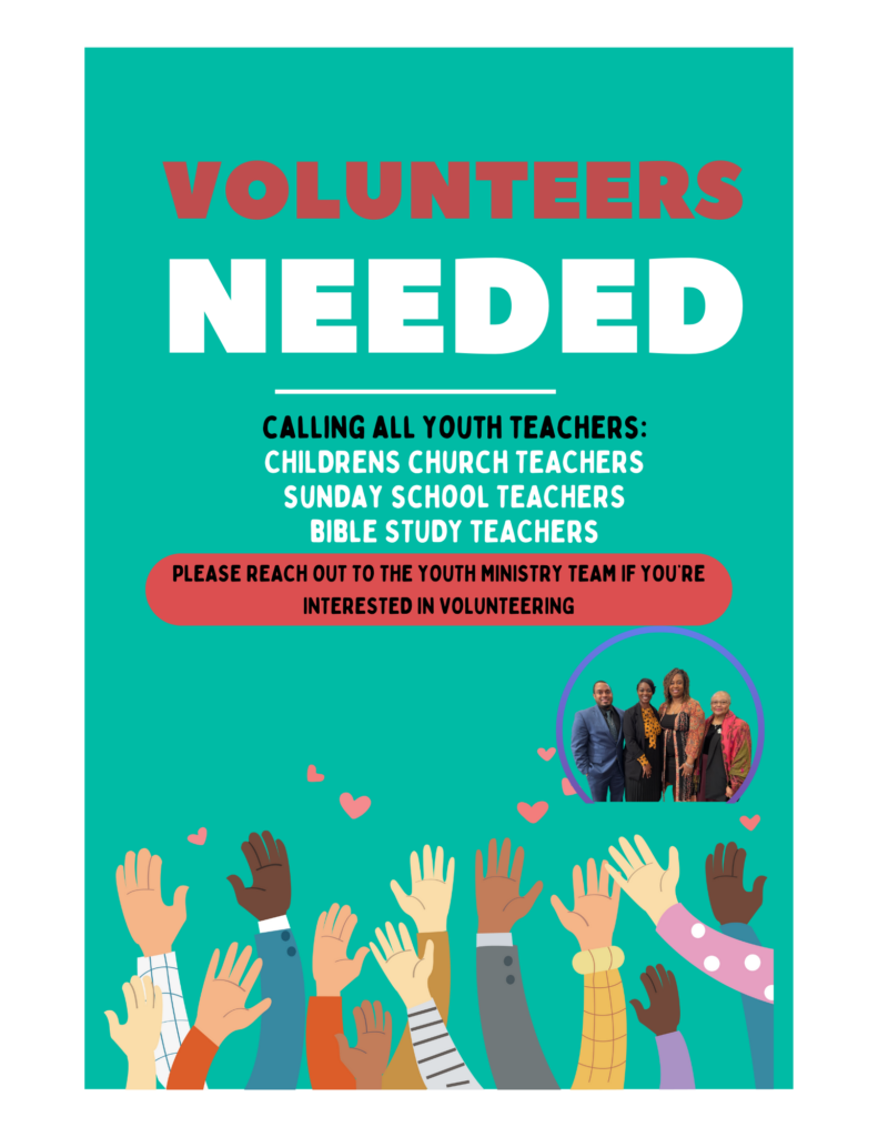 The Youth and Children’s Ministry is looking for volunteers to serve as teachers for Children’s Church, Sunday School, and Bible Study. Please reach out to the ministry’s Leadership Team if you’re interested!