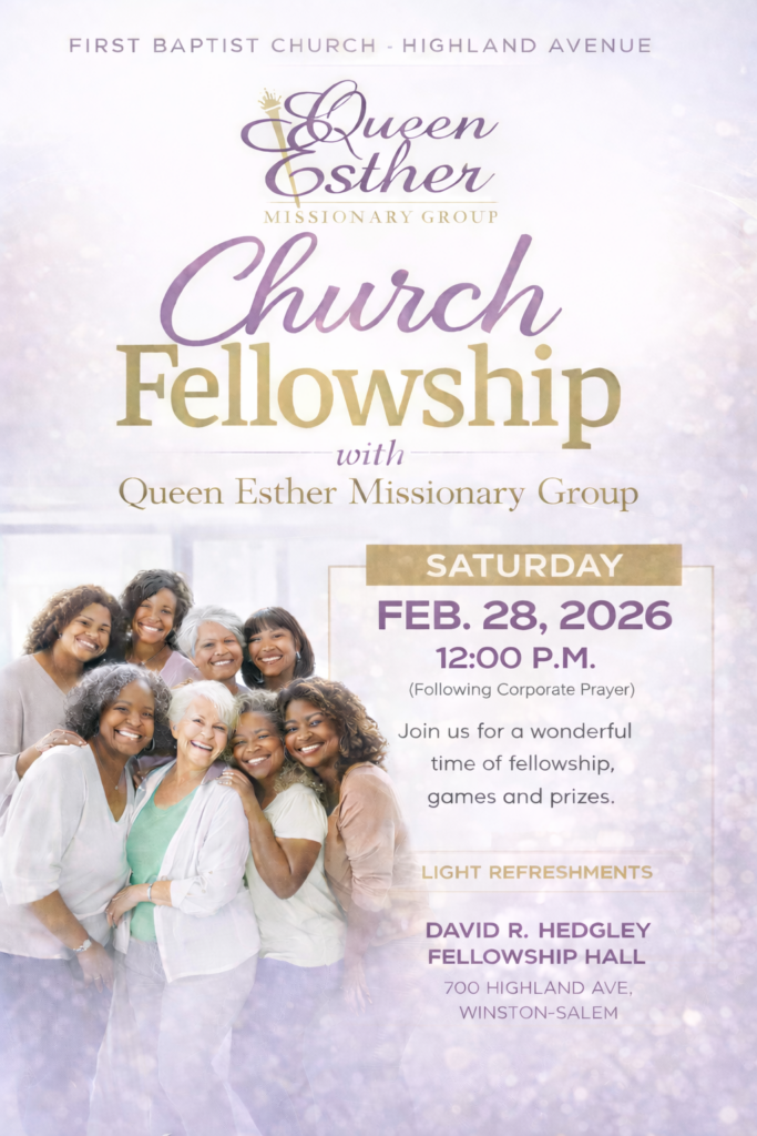You’re invited to join the Queen Esther Missionary Group for a Church Fellowship on Saturday, February 28, at 12:00 p.m. in the David R. Hedgley Fellowship Hall immediately following corporate prayer.