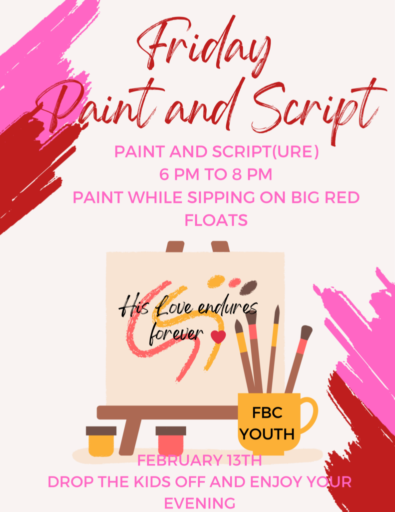All youth are invited to join the Youth and Children’s Ministry for this painting and scripture event on Friday, February 13, from 6:00 p.m. until 8:00 p.m.!